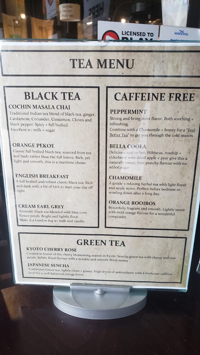 Many varieties of tea. Black, green, herbal, and blends available. 8, 12, 16, or 20 ounce
